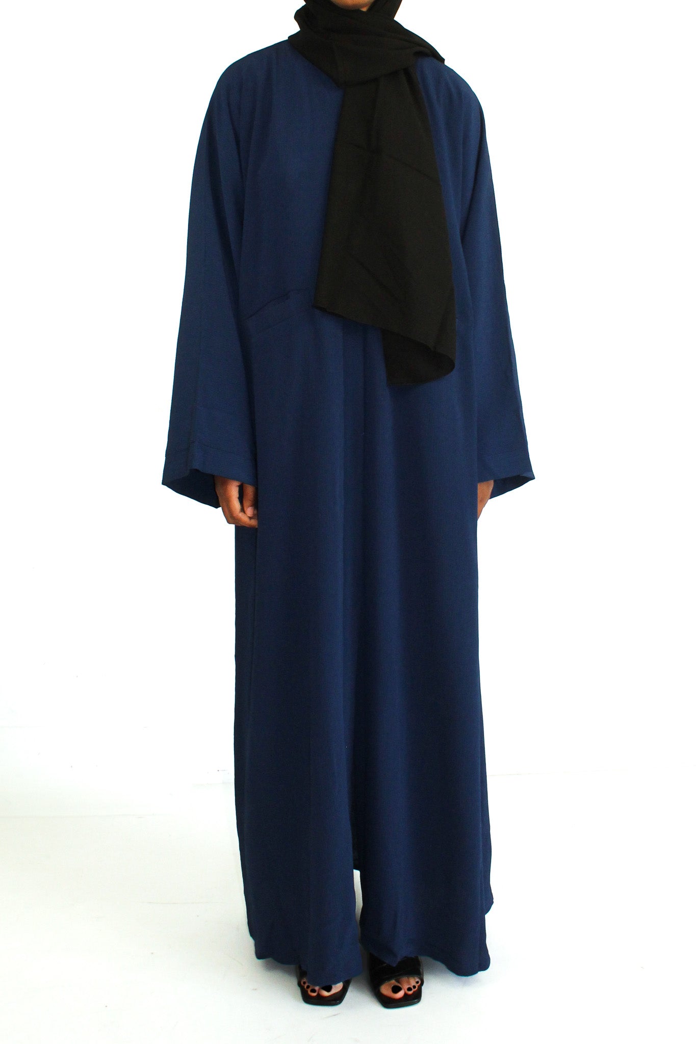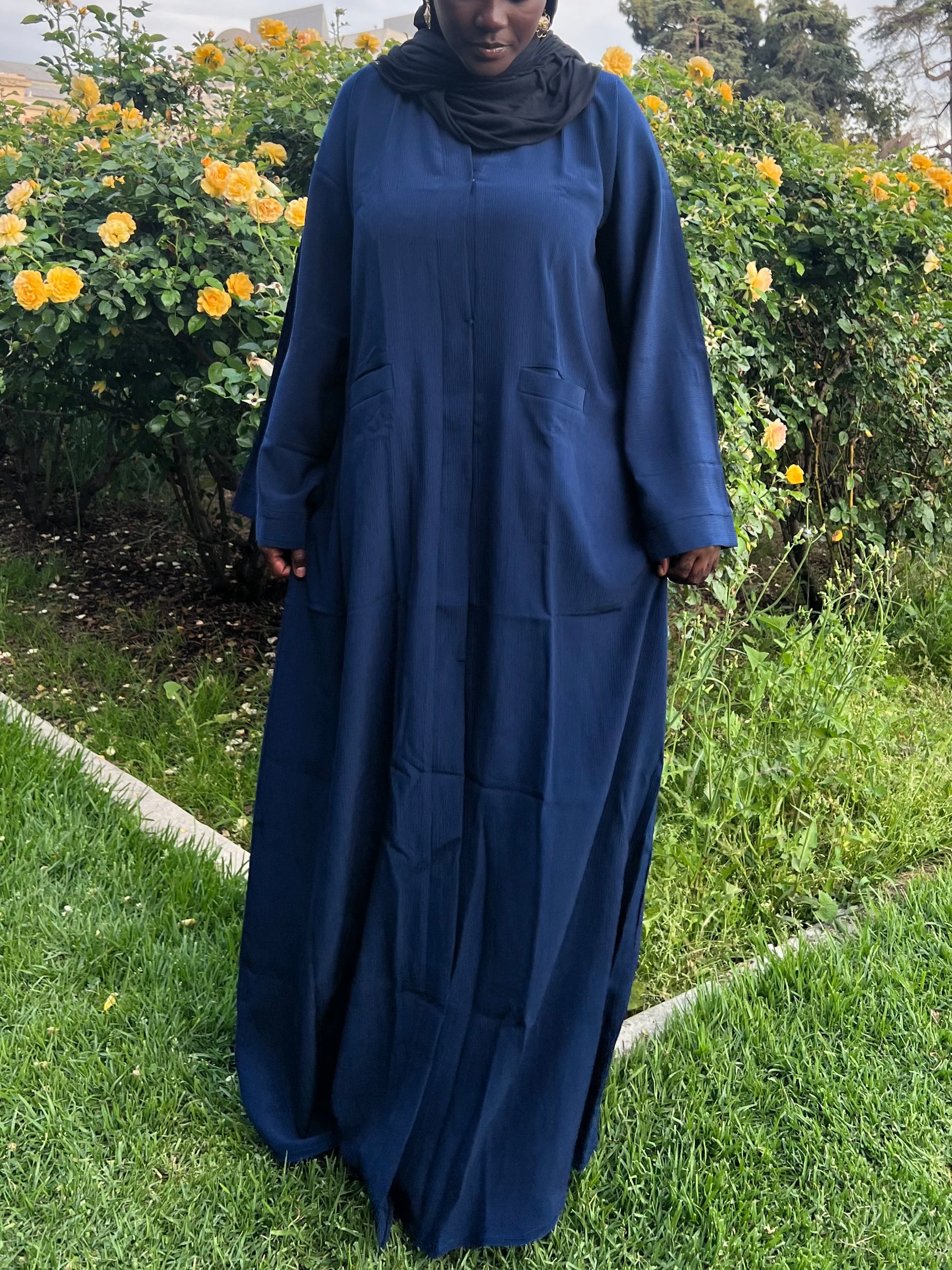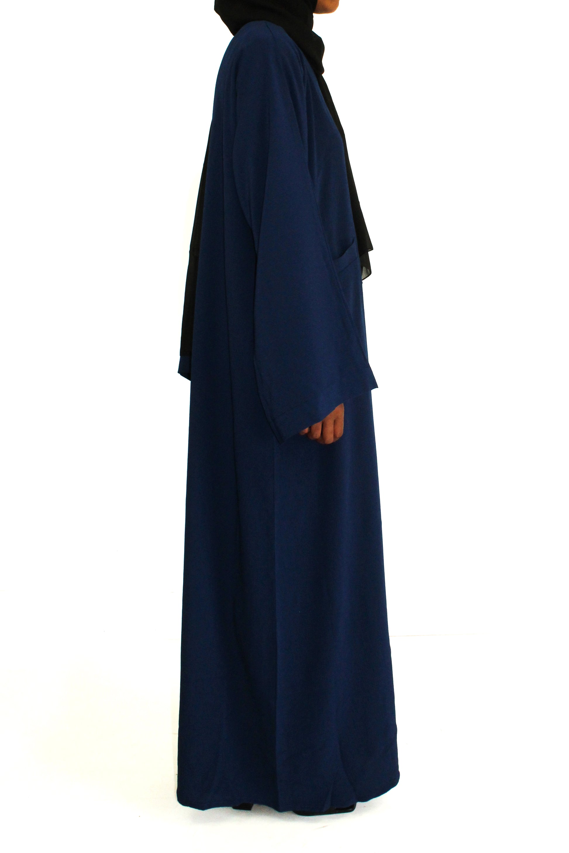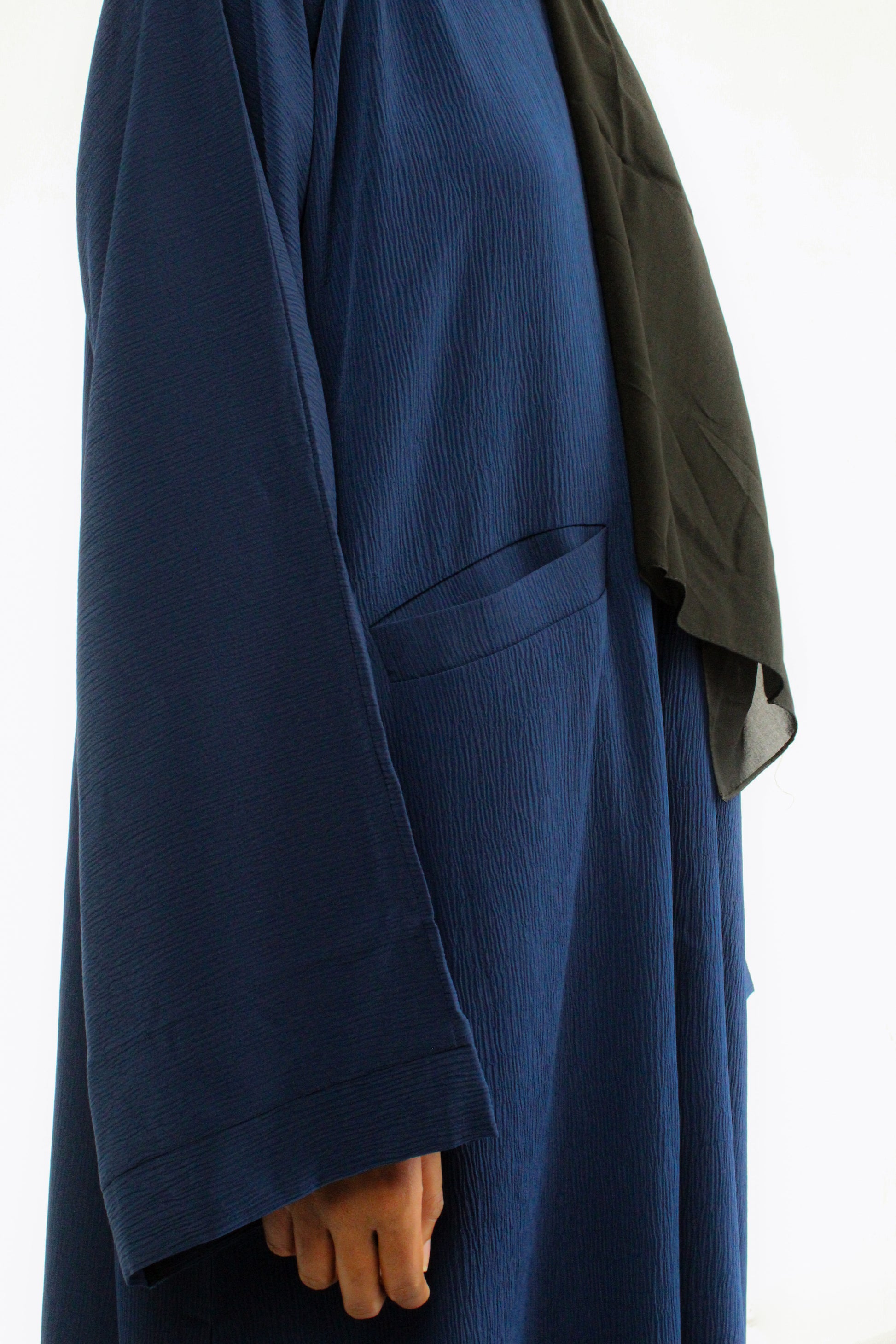 The Neptune abaya is a rich deep blue, reminiscent of the ocean. This piece is made of a lightweight textured fabric with an open front design. It features roomy pockets to house your various goodies and snap buttons that allow it to be worn open or closed.